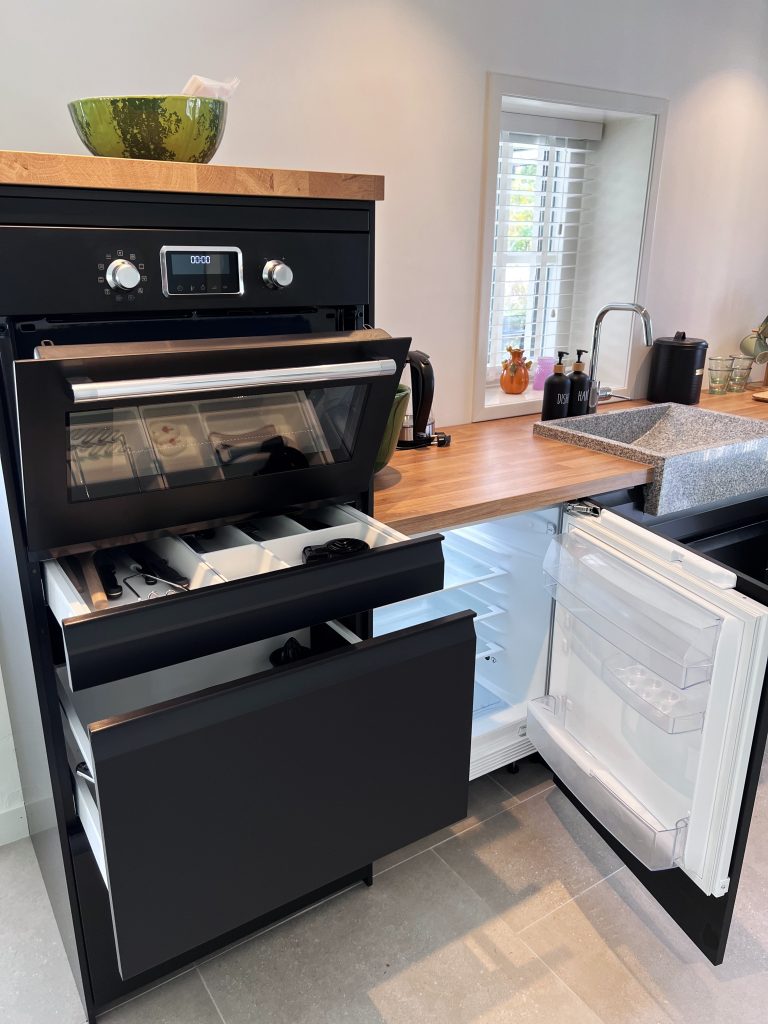 De afwasmachine wordt bediend met de knoppen bovenaan in de deur. Onder het aanrecht vind je de tablets voor de vaatwasser die je vrij kunt gebruiken.